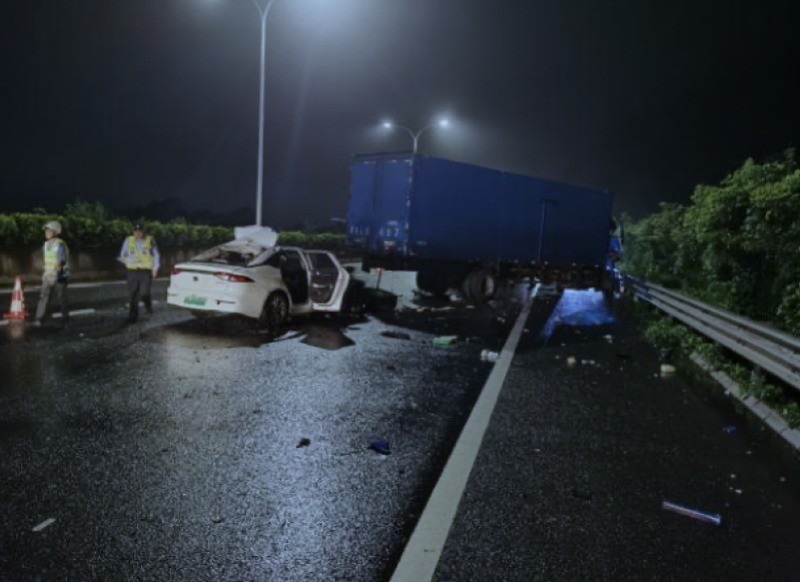 1分钟46秒后,何某华驾驶粤ADK06**号小型轿车,搭载乘客邝某华、蒋某娣、杨某颖、杨某先,由西往东沿中间车道行驶,车头碰撞粤BLS4**号重型厢式货车车尾。事故造成蒋某娣和杨某颖当场死亡,何某华受伤经医院抢救无效于19日3时33分死亡,邝某华、杨某先受伤。